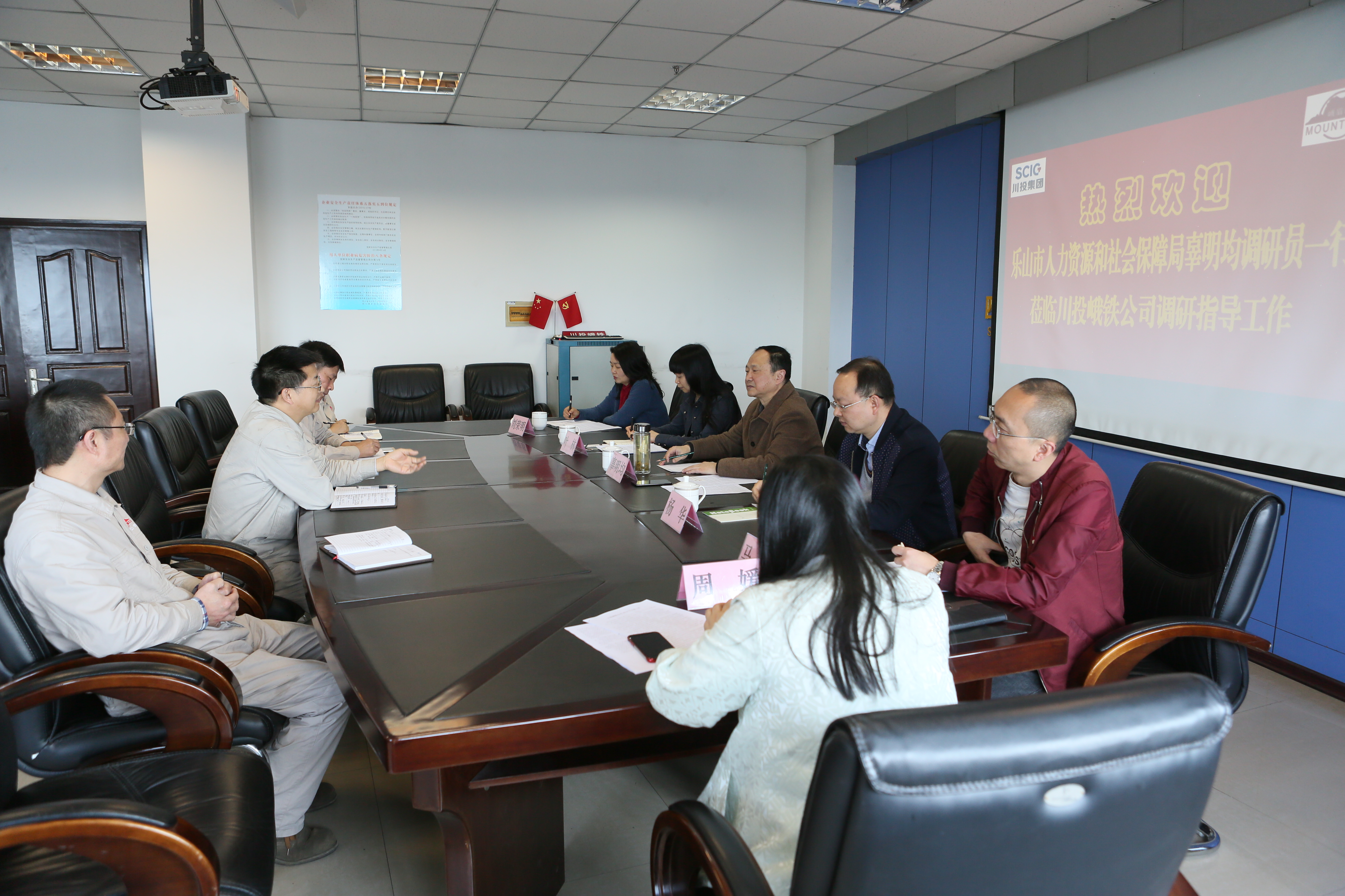 3月22日,樂山市人力資源和社會(huì)保障局辜明均調(diào)研員率樂山市行政審批科科長(zhǎng)楊華、主任科員馬松以及峨眉山市人力資源和社會(huì)保障局勞動(dòng)仲裁院院長(zhǎng)葉林等一行6人專程到川投峨鐵公司開展調(diào)研。川投峨鐵公司黨委書記、總經(jīng)理唐華應(yīng),黨委副書記、紀(jì)委書記、工會(huì)主席余華偉以及公司人力資源處部門負(fù)責(zé)人在公司908會(huì)議室接待了辜明均一行。